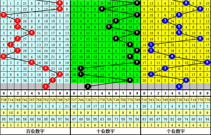 其中,号码0-9开出次数分别为:号码0开出2次、1开出3次、2开出2次、3开出4次、4开出2次、5开出3次、6开出1次、7开出4次、8开出7次、9开出2次。