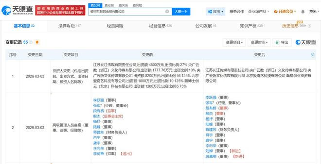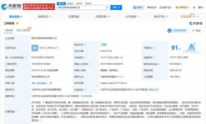 {jz:field.toptypename/}星河互联网电视有限公司竖立于2012年7月,法定代表东谈主为张军,注册本钱约1.78亿东谈主民币,方向范围包括播送电视节目制作方向、第一类升值电信业务、第二类升值电信业务等。鼓动信息显现,该公司现由央广云听文化传媒有限公司、北京爱奇艺科技有限公司及上述新增鼓动等共同抓股。
