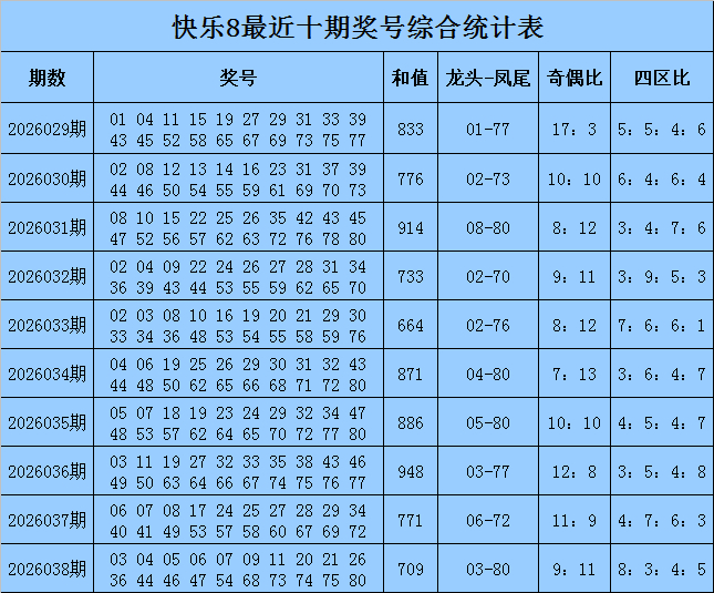福彩快乐8第2026038期开奖回顾:03 04 05 06 07 09 11 20 21 26 36 44 46 47 54 68 73 74 75 80,其中奖号和值为709,跨度为77,奇偶比开出9:11,012路比开出7:4:9,四区比开出8:3:4:5。