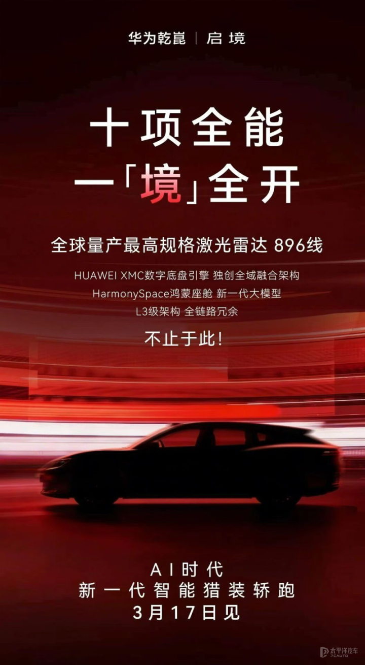 3月5日,由华为与广汽集团聚合打造的全新品牌,启境汽车官方文牍旗下首款猎装轿跑车将于3月17日发布,新车将搭载各人量产最高规格激光雷达896线,HUAWEIXMC数字底盘引擎、HarmonySpace鸿蒙座舱新一代大模子等最新技能。