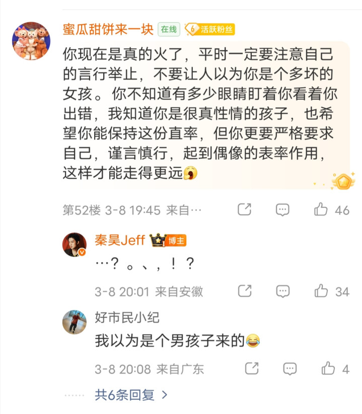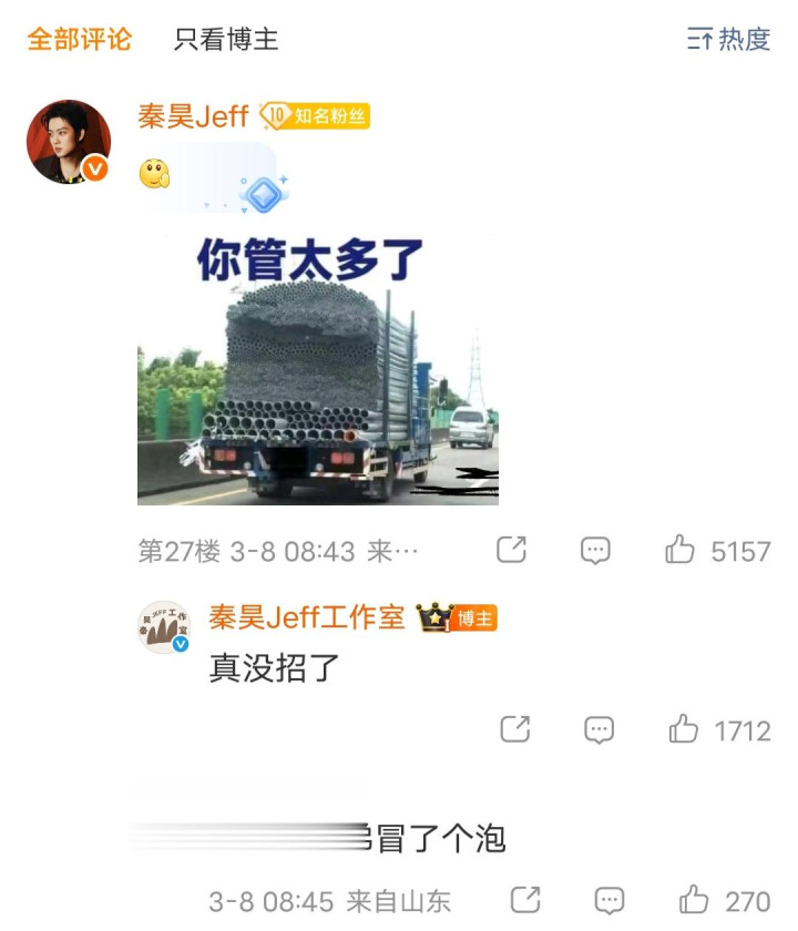 粉丝互动中,秦昊对催起床留言回怼“你管太多了”,进一步强化“真确东谈主设”。