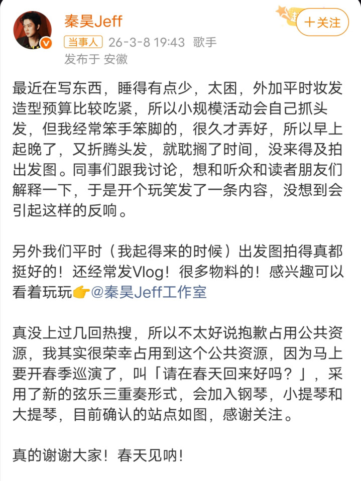 秦昊本东谈主随后发文解释:因熬夜创作缺觉,加上小步履需“自理妆发”(预算有限),弄头发耗时导致起晚。他幽默报告热搜:“很庆幸占用各人资源”,并借重官宣春季巡演“请在春天雅致好吗?”