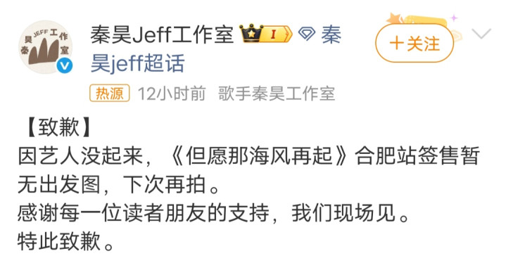 2026年3月8日,秦昊职责室(歌手秦昊,好妹妹乐队成员)为合肥站新书《希望那海风再起》签售步履发布致歉公告,奏凯声明“因艺东谈主没起来,暂无启航图,下次再拍”。