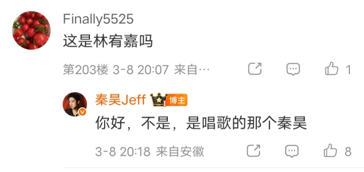 秦昊回复谈:“你好,不是,庄闲和游戏app是唱歌的阿谁秦昊。”